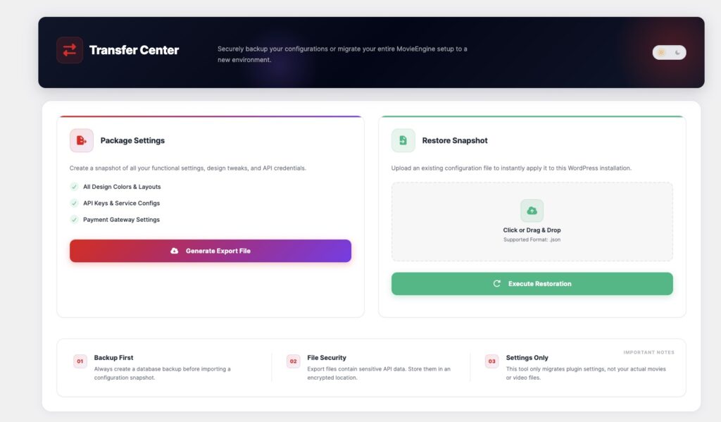 The Transfer Center allows you to export, backup, and restore your plugin configuration easily.