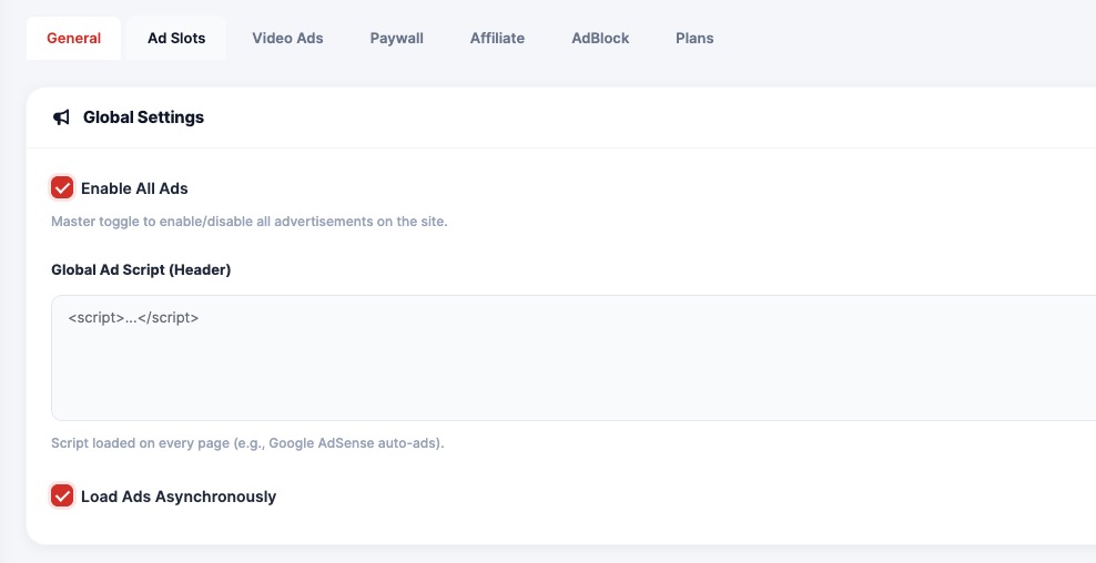 Master switch to enable or disable all advertisements across the site. - Global Ad Script (Header)