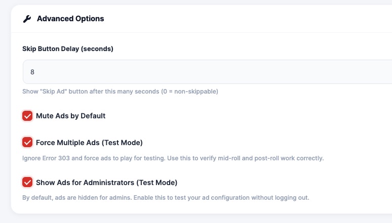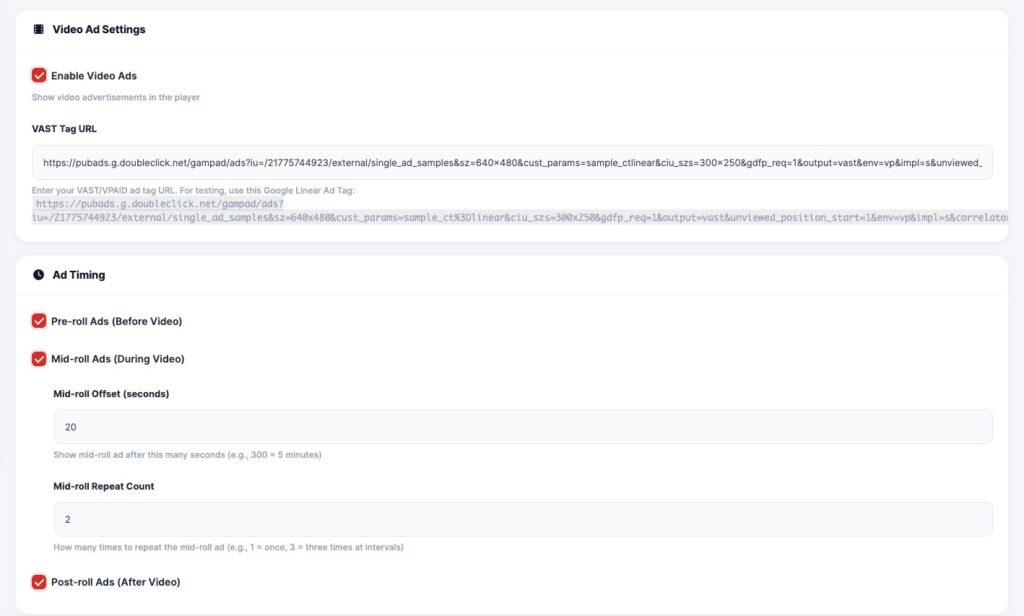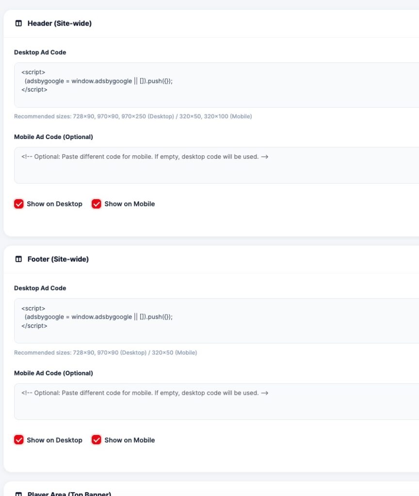 The Movie Engine advertisement system allows you to display ads across multiple areas of your platform, including global site placements and inside the video player. This flexible system supports both display ads (HTML/JS) and video ads (VAST), enabling you to monetize both content pages and video playback.