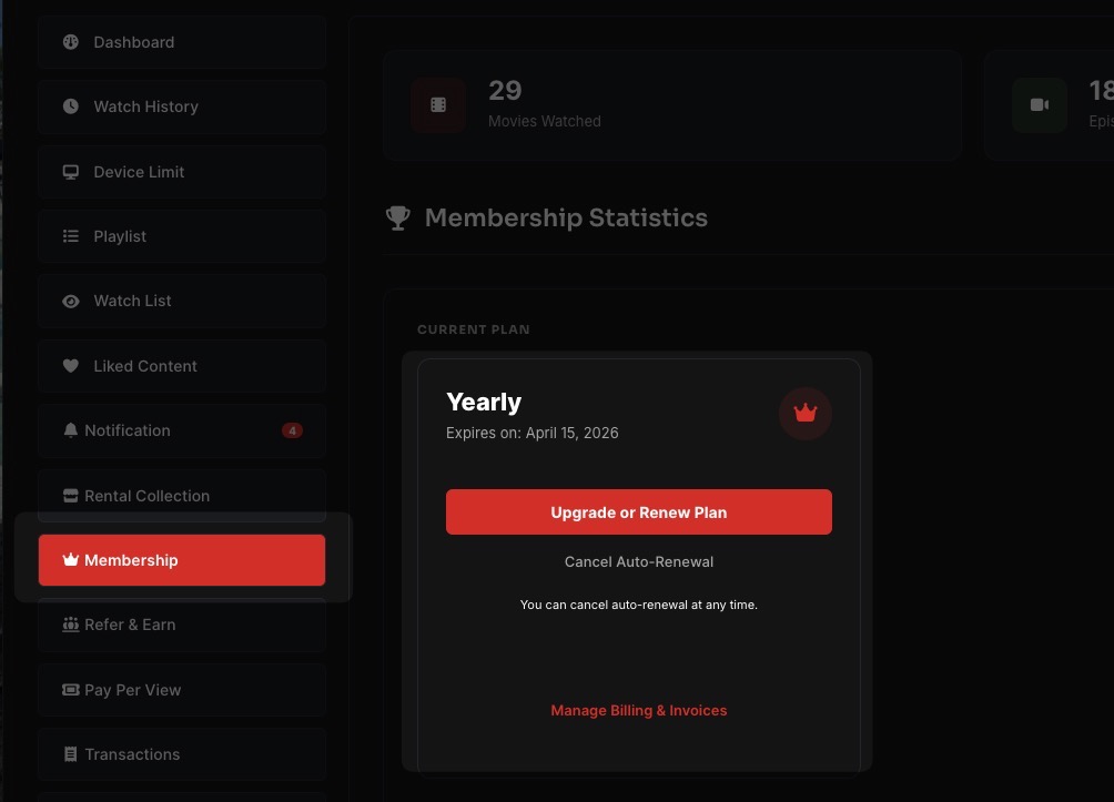 The Billing & Access page allows users to manage their subscriptions, purchases, and access to premium content. It centralizes all monetization-related features, making it easy for users to track payments and control their access level.