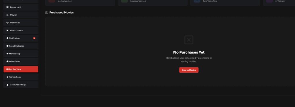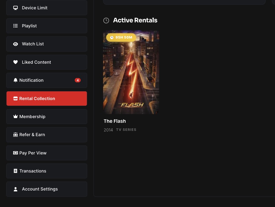 Displays rented content with access duration.